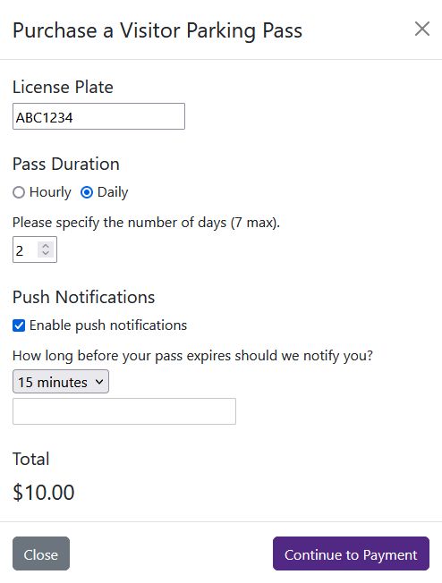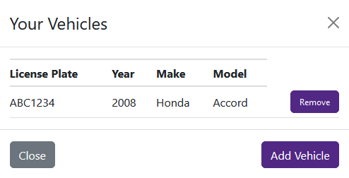 When buying a pass, users specify their license plate and pass duration and may opt to receive an email notification when their pass is close to expiration. We also implemented a feature allowing registered users to save their vehicle(s) information for a more streamlined checkout process (see below).